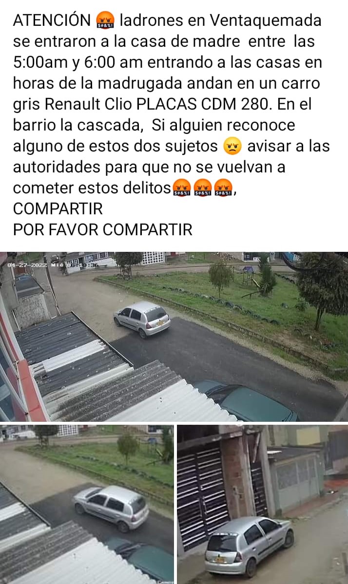 Según indagaciones realizadas por Matinal Noticias estos mismos delincuentes serían los responsables de varios hurtos en el municipio de Villapinzón, al igual que en la ciudad de Tunja donde han quedado grabados gracias a las cámaras de vigilancia. Al parecer los hombres que hoy son buscados por las autoridades se movilizan en un vehículo gris Renault Clio como lo evidencias las denuncias de las comunidades.
