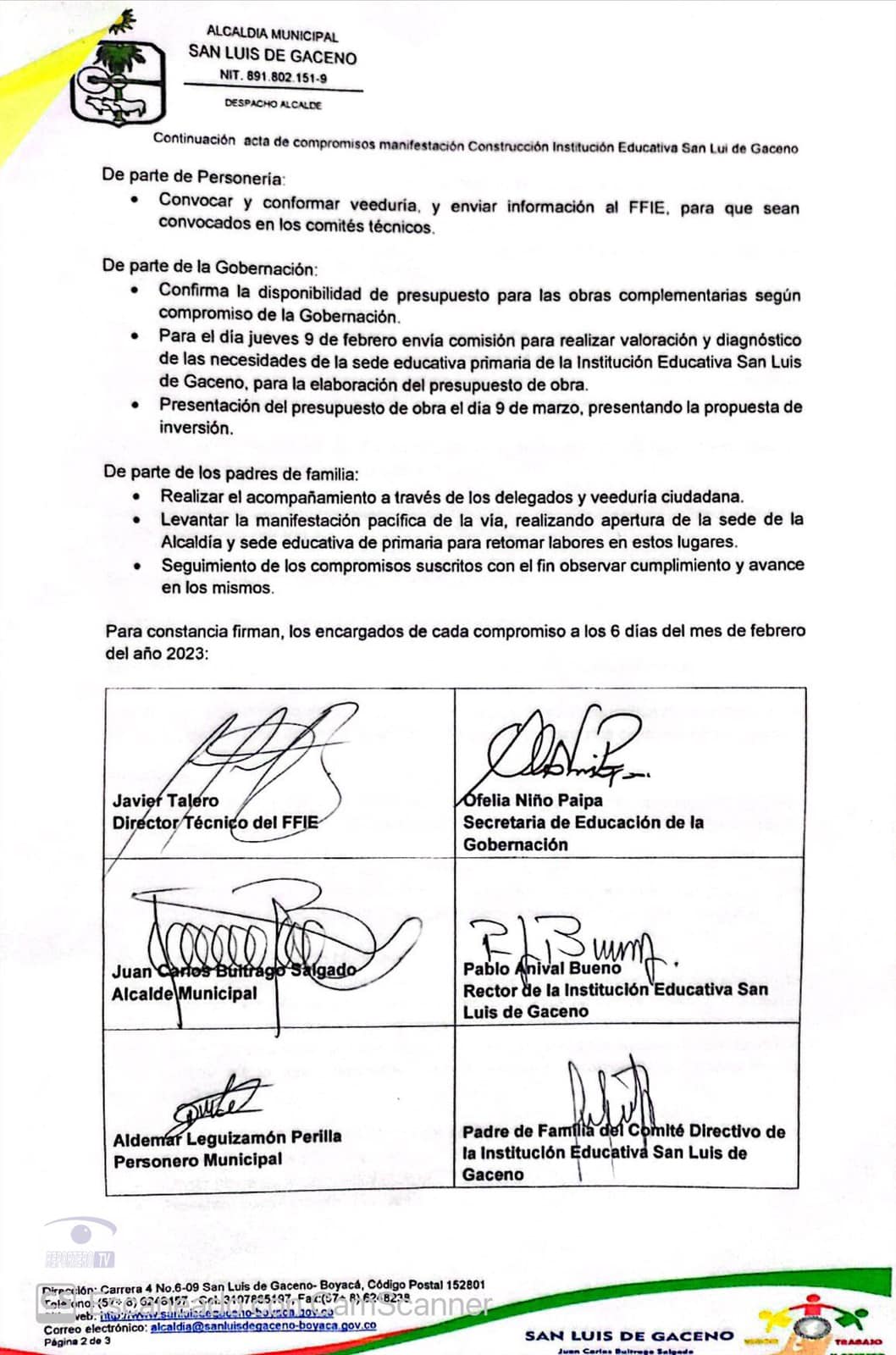 Entre líneas se lee también que la Administración municipal deberá concretar el arreglo y disponibilidad de agua de las tres baterías de baños con las que cuenta la sede educativa primaria, y tener un listo un informe de seguimiento de obra para el próximo 15 de febrero. Por su parte, la Institución Educativa San Luis de Gaceno tendrá como responsabilidad enviar informe SIMAT al FFIE, enviar plano de la sede a la gobernación de Boyacá y presentar comunicación a la alcaldía con las necesidades de la institución.