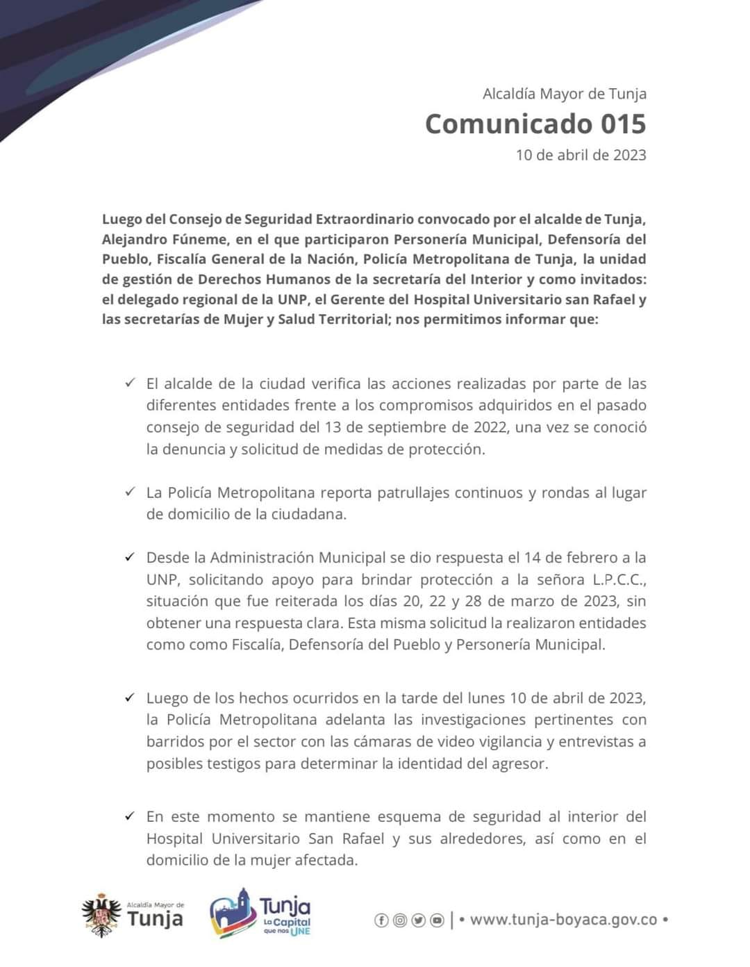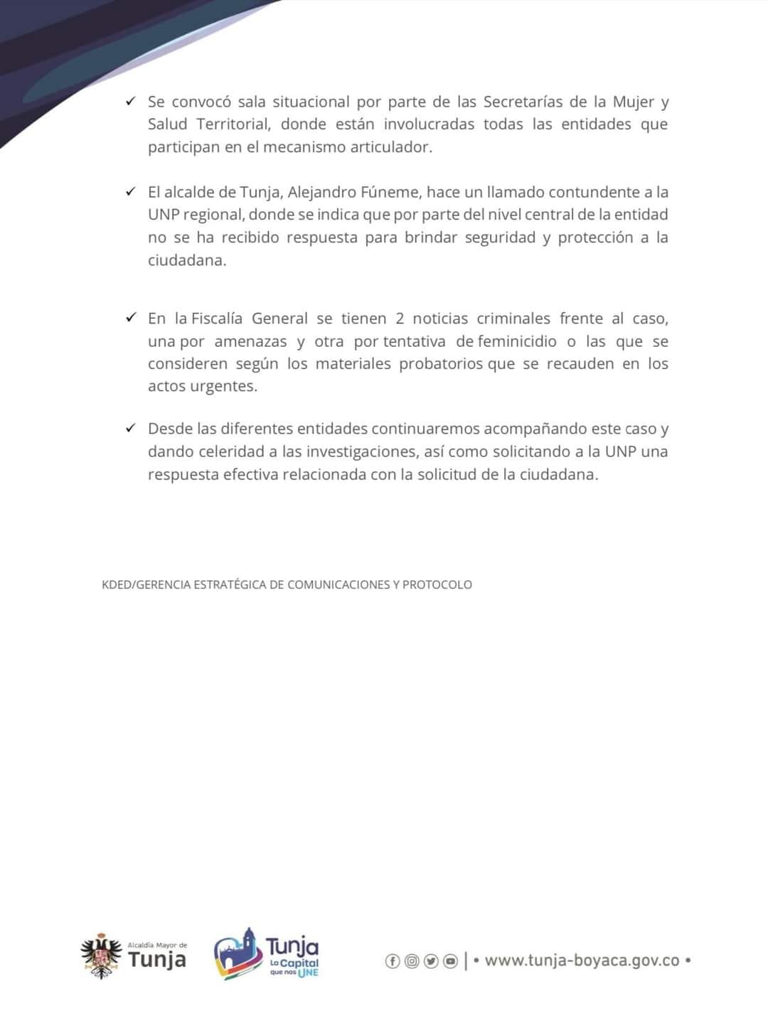 Kimberly Andrea Ochoa Araque, vocera de la Plataforma Feminista Boyacense y coordinadora jurídica del colectivo La Ramona, señalo que en este caso se presentó una clara inoperancia de las autoridades “se enfatiza con que se denunció desde el 2022 que tenía amenazas en contra de su vida y la UNP ya había emitido orden de esquema de protección. Fallaron todas las autoridades departamentales, incluyendo Policía, Alcaldía, Defensoría del Pueblo y el mecanismo articulador con sus autoridades integrantes de todo Boyacá, que conociendo el caso omitieron atención temprana”.
