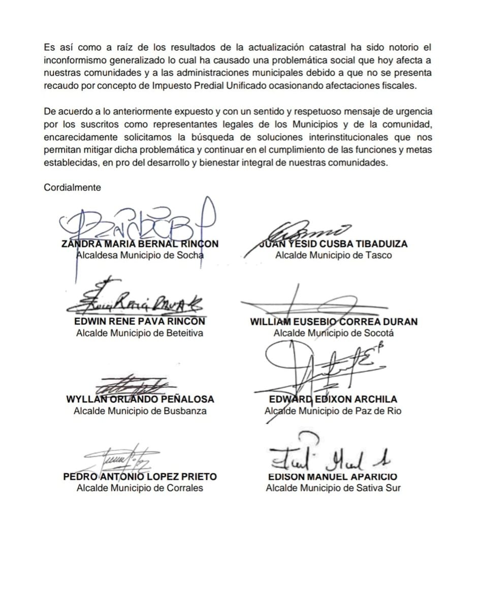 Alcaldes de Socha, Tasco, Beteitiva, Socotá, Busbanza, Paz del Rio, Corrales y Sativasur, exigen ante el gobierno nacional, intervención para aclarar tarifas resultantes de la actualización catastral, entregada por el Instituto Geográfico Agustín Codazzi ‘IGAC’.