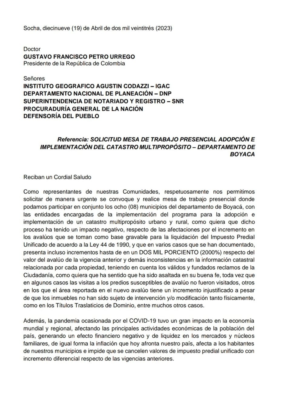 A la petición de los municipios, se sumó la Gobernación de Boyacá, entidad que refiere a su vez que los procesos de actualización en estos municipios presentan serías inconsistencias de forma y de fondo, por lo cual deben ser revisados. Se espera la respuesta del Gobierno Nacional ante la apremiante situación.