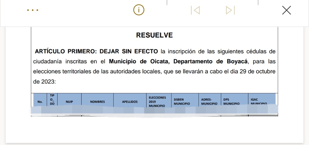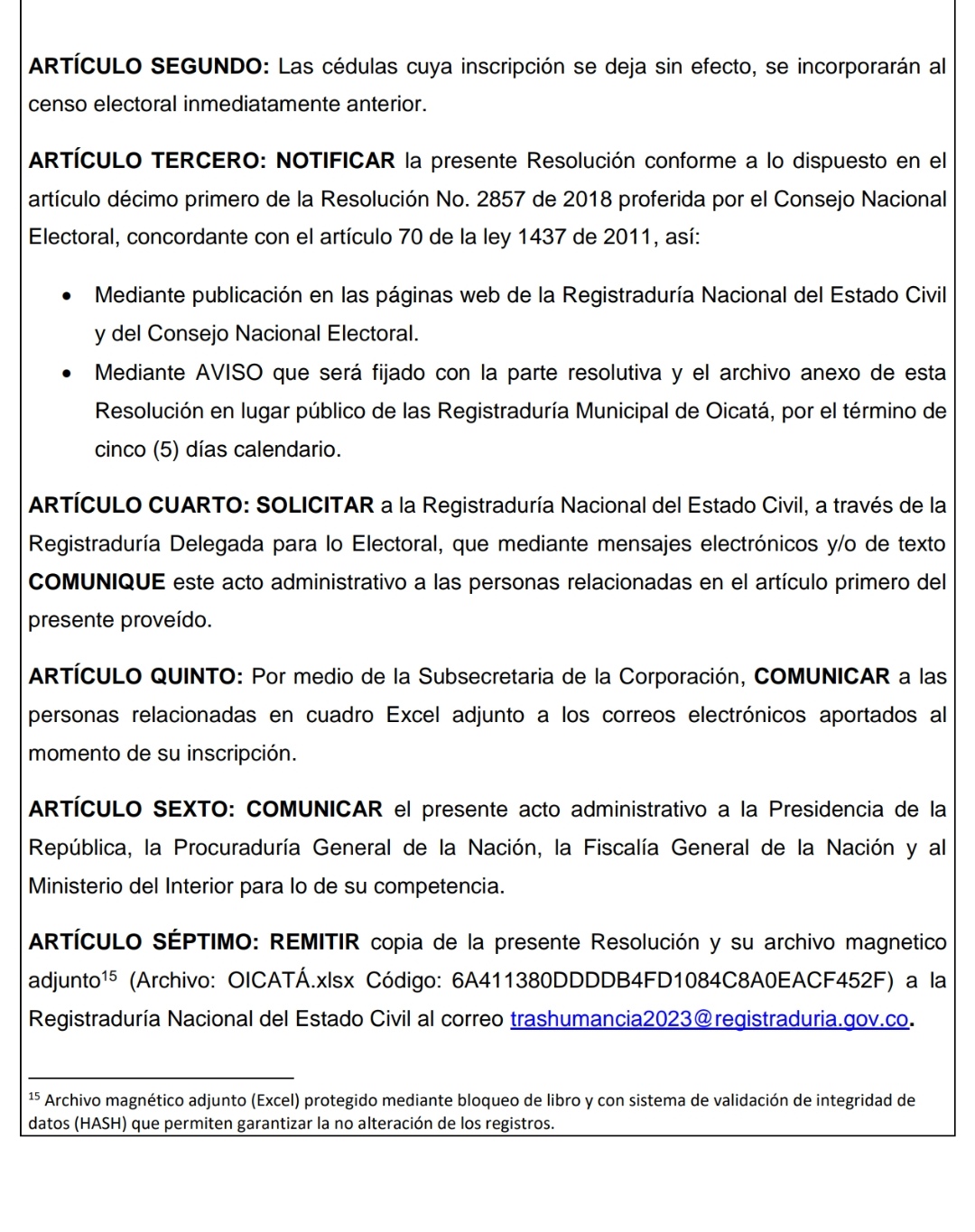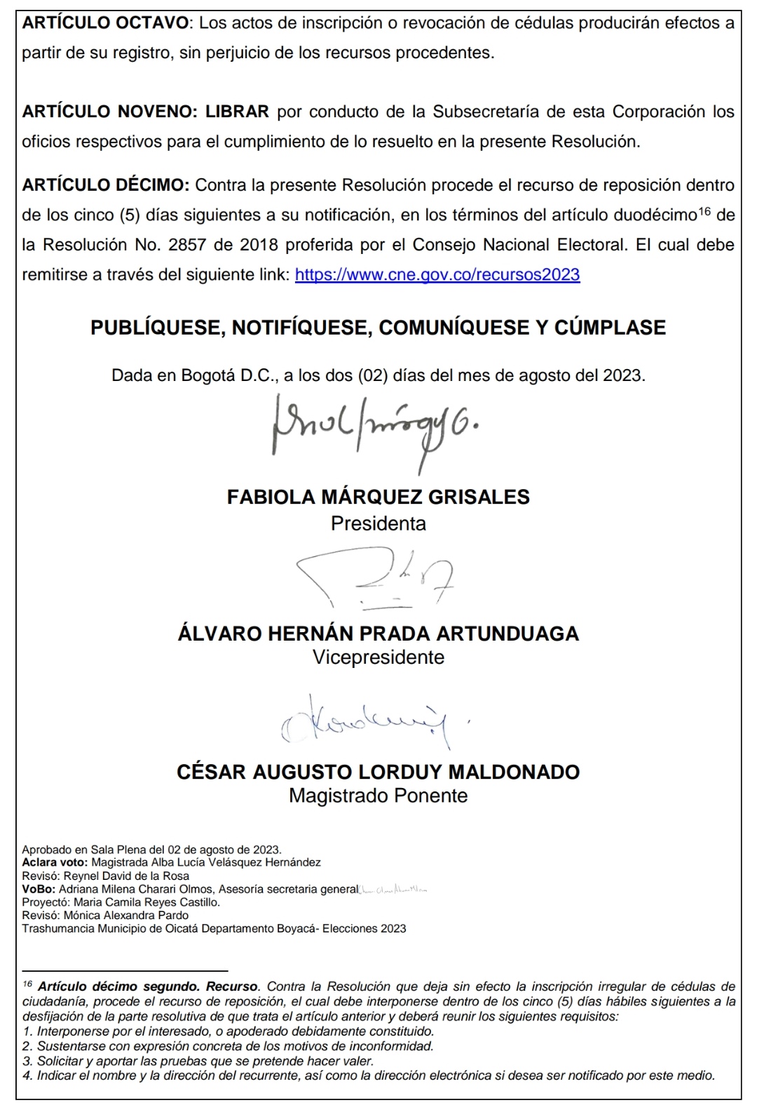 A través de una Resolución el Consejo Nacional Electoral adoptó algunas decisiones dentro del procedimiento administrativo breve y sumario que se adelanta para determinar la posible inscripción irregular de cédulas de ciudadanía y extranjería en el Municipio de Oicatá del Departamento de Boyacá, con ocasión de las elecciones a realizarse el próximo 29 de octubre de 2023.