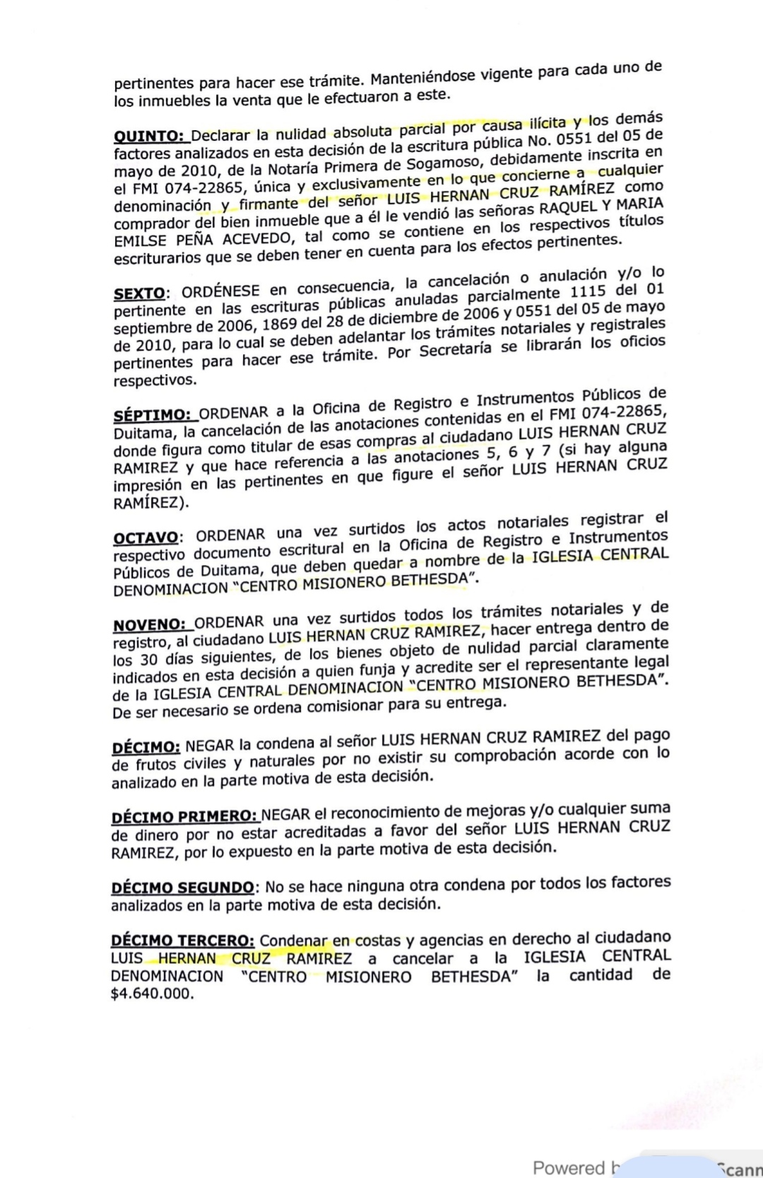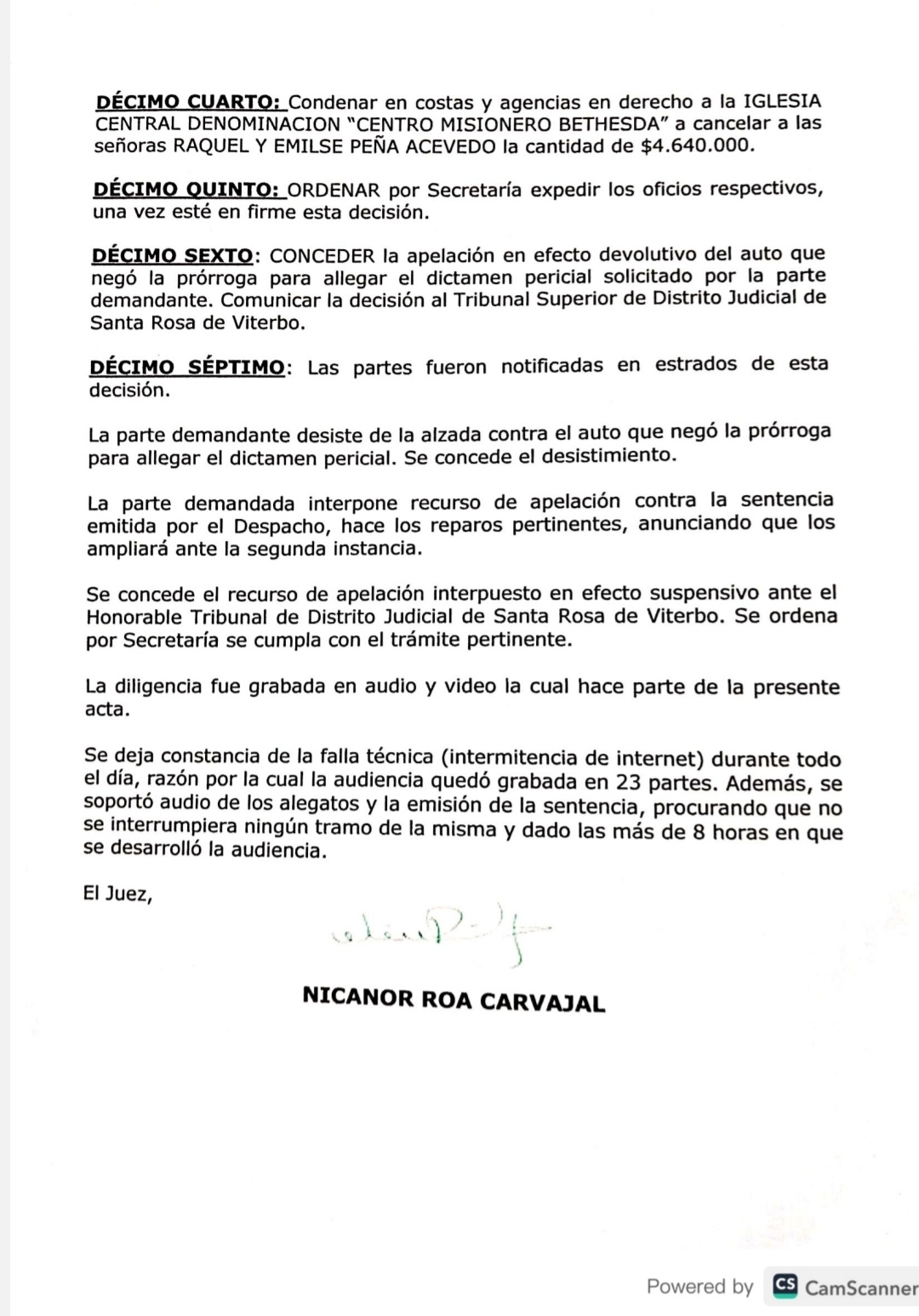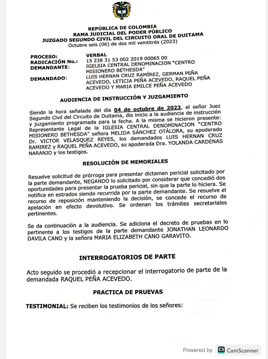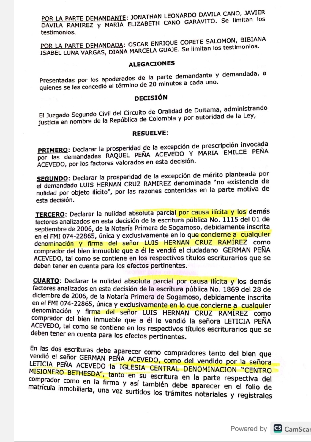 “También hubo demora por causa de por pandemia y virtualidad, pero el señor Juez Segundo Civil de Duitama, en una audiencia de más de 12 horas, falló a favor de la comunidad el pasado 04 de octubre; es así como declara la nulidad parcial y se da la orden de que el inmueble quede a nombre de la iglesia”, dijo Velázquez.