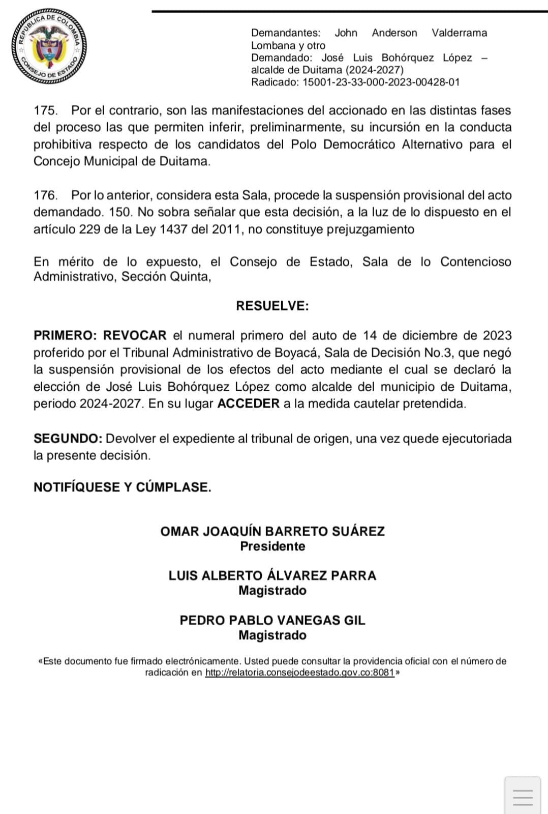 En auto del día anterior 14 de marzo, la Sala de lo Contencioso Administrativo, Sección Quinta del Consejo de Estado con ponencia del magistrado Pedro Pablo Vanegas Gil se revoca el numeral primero del auto de 14 de diciembre de 2023 proferido por el Tribunal Administrativo de Boyacá, Sala de Decisión No.3, que negó la suspensión provisional de los efectos del acto mediante el cual se declaró la elección de José Luis Bohórquez López como alcalde del municipio de Duitama, periodo 2024-2027. En su lugar se accede a la medida cautelar pretendida.