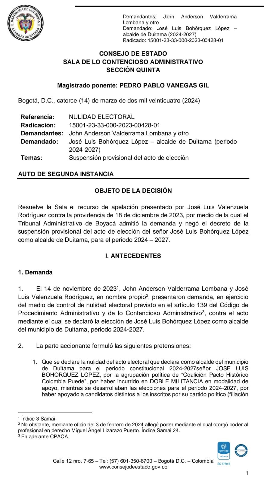 El Consejo de Estado devolvió el expediente al Tribunal de origen, para que siga el trámite la demanda que interpusieron los ciudadanos John Anderson Valderrama Lombana y José Luis Valenzuela Rodríguez, en ejercicio del medio de control de nulidad electoral previsto en el artículo 139 del Código de Procedimiento Administrativo y de lo Contencioso Administrativo, contra el acto mediante el cual se declaró la elección de José Luis Bohórquez López como alcalde del municipio de Duitama, periodo 2024-2027 por la agrupación política de “Coalición Pacto Histórico Colombia Puede”, por haber incurrido en DOBLE MILITANCIA en modalidad de apoyo, mientras se desarrollaban las elecciones para el periodo 2024-2027, por haber apoyado a candidatos distintos a los inscritos por su partido político y que pertenecían a Colombia Humana para el concejo municipal de la ciudad de Duitama.