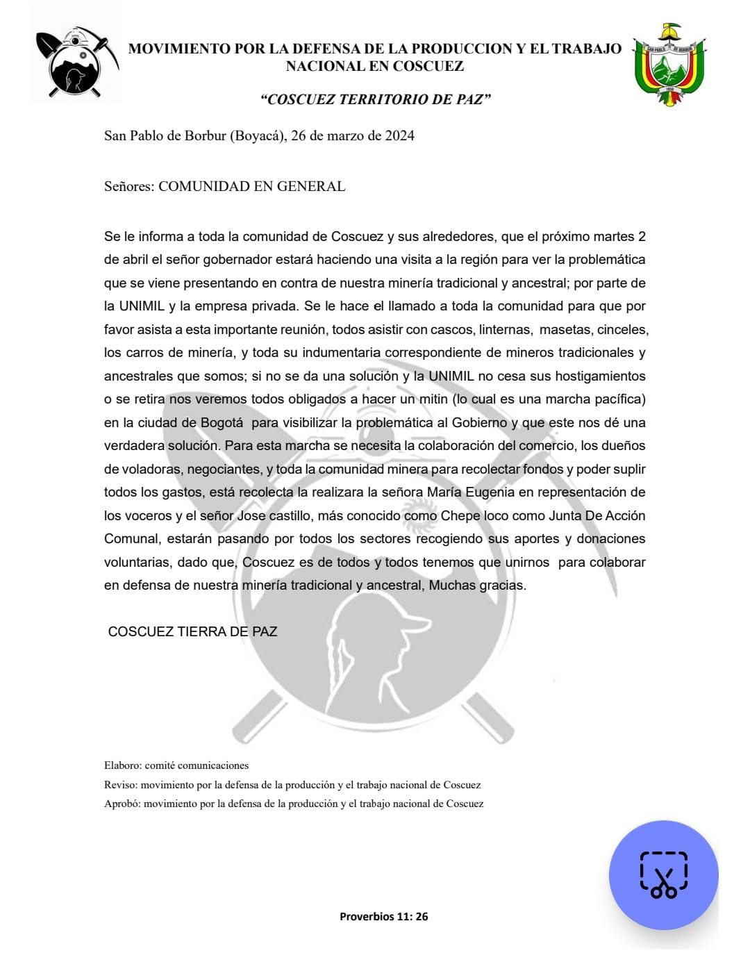 En una reunión convocada en Coscuez, municipio de San Pablo de Borbur, representantes de diversas organizaciones, entre ellas Juntas de Acción Comunal, Plataforma de Juventudes y asociaciones de mineros ancestrales, se pronunciaron ante el conflicto entre la comunidad minera, la multinacional minera Fura Gems y la Unidad Nacional contra la Minería llegal y Antiterrorismo de la Policía – Unimil, esta última, acusada de atropellos contra los mineros en favor de los intereses de la multinacional.