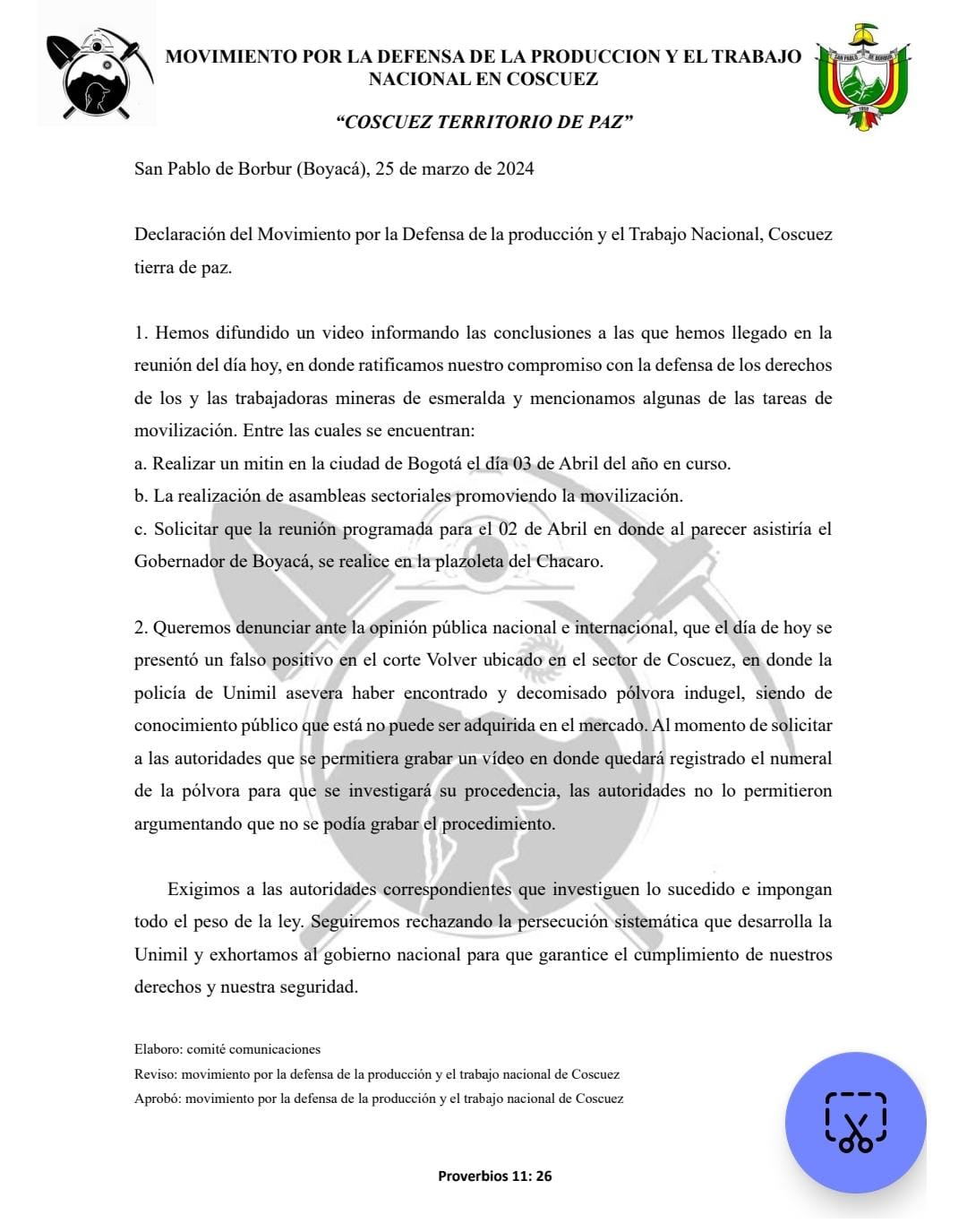 «Queremos denunciar ante la opinión pública nacional e internacional, que el día de hoy se presentó un falso positivo en el corte Volver ubicado en el sector de Coscuez, en donde la policía de Unimil asevera haber encontrado y decomisado pólvora indugel, siendo de conocimiento público que está no puede ser adquirida en el mercado; al momento de solicitar a las autoridades que se permitiera grabar un video en donde quedará registrado el numeral de la pólvora para que se investigará su procedencia, las autoridades no lo permitieron argumentando que no se podía grabar el procedimiento», señaló uno de los voceros.