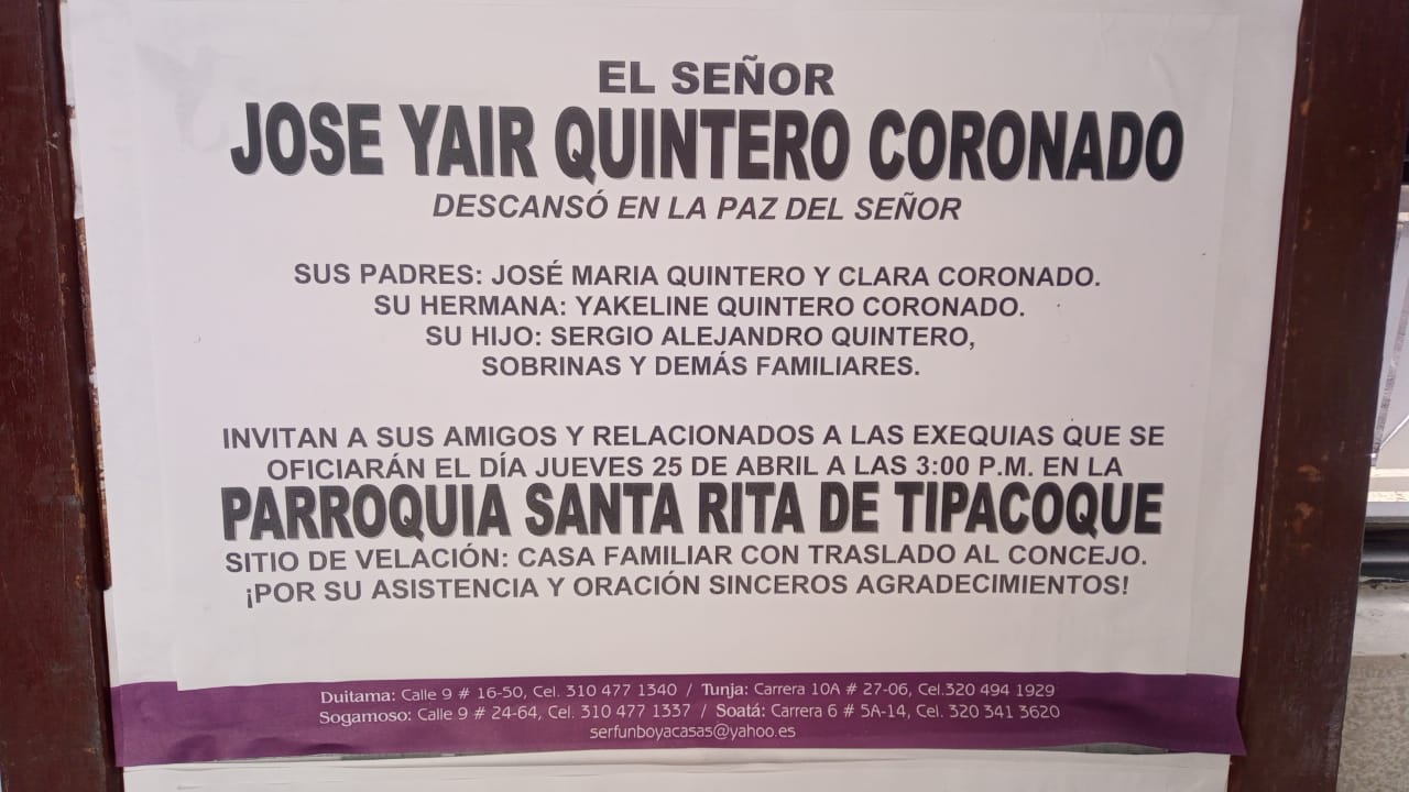 Sus honras fúnebres se llevarán a cabo el próximo jueves 25 de abril a las 3:00 pm en la Parroquia Santa Rita de Tipacoque.