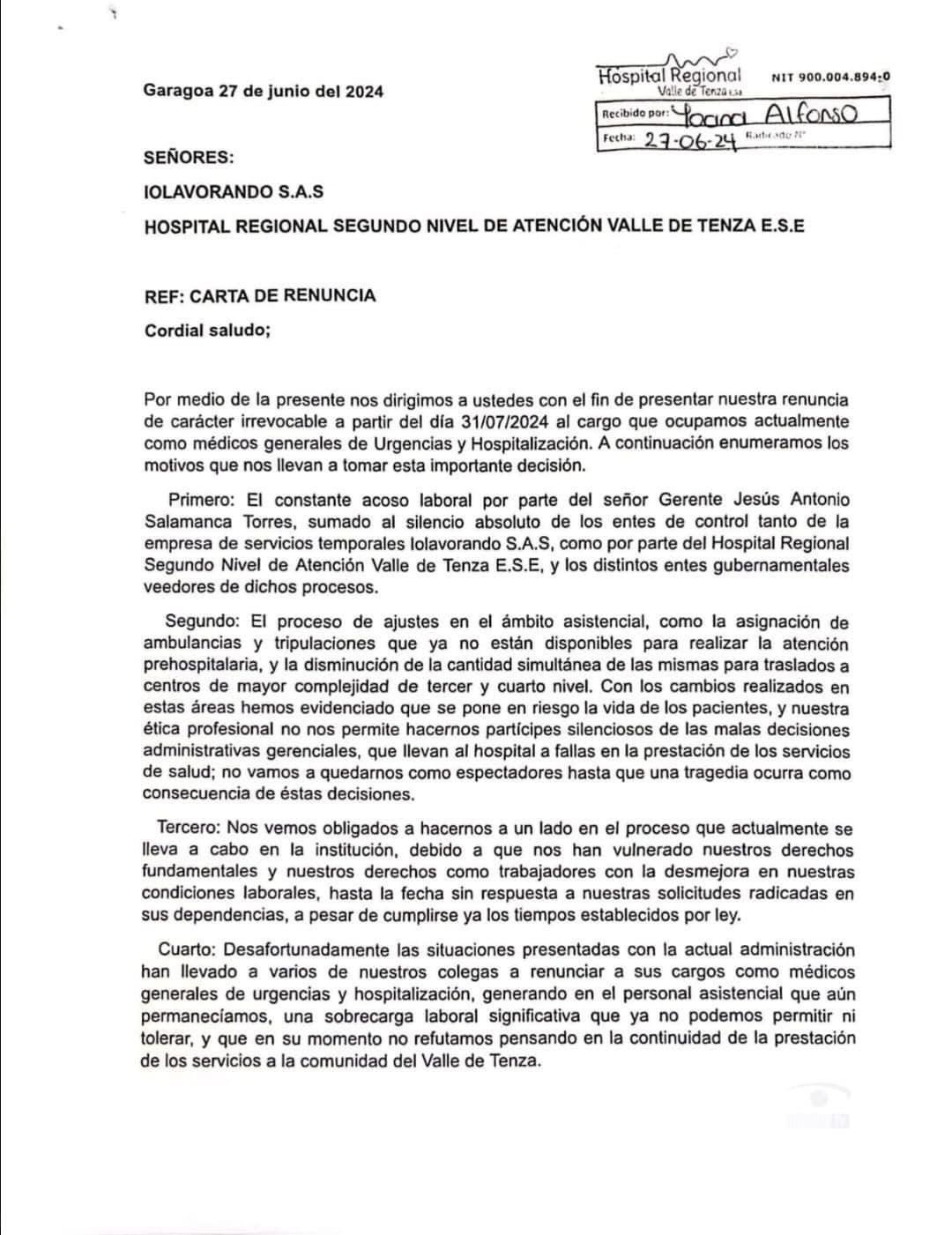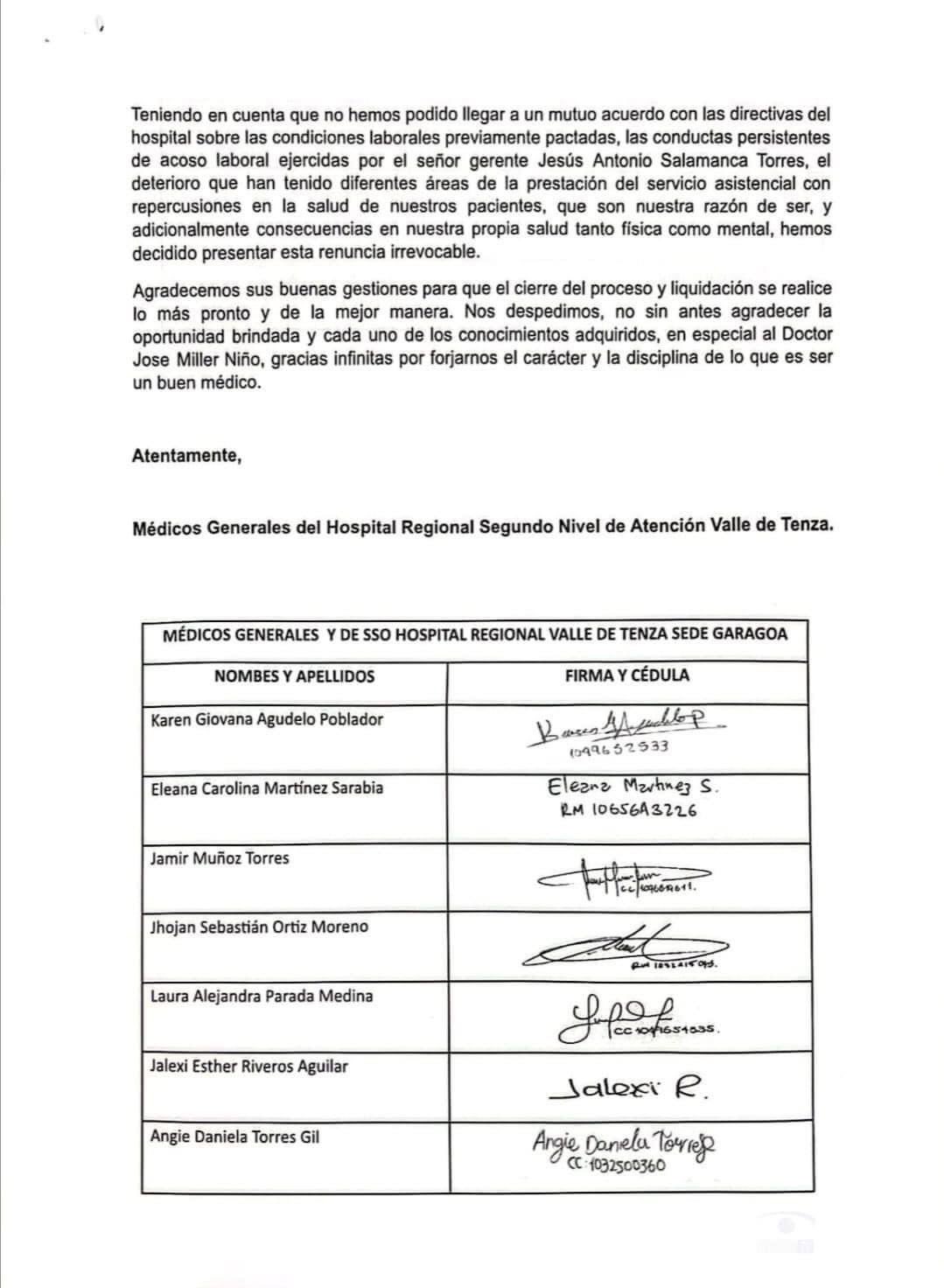 Cuarto: Desafortunadamente las situaciones presentadas con la actual administración han llevado a varios de nuestros colegas a renunciar a sus cargos como médicos generales de urgencias y hospitalización, generando en el personal asistencial que aún permanecíamos, una sobrecarga laboral significativa que ya no podemos permitir ni tolerar, y que en su momento no refutamos pensando en la continuidad de la prestación de los servicios a la comunidad del Valle de Tenza», dice el documento de tres paginas conocido por este Noticiero.