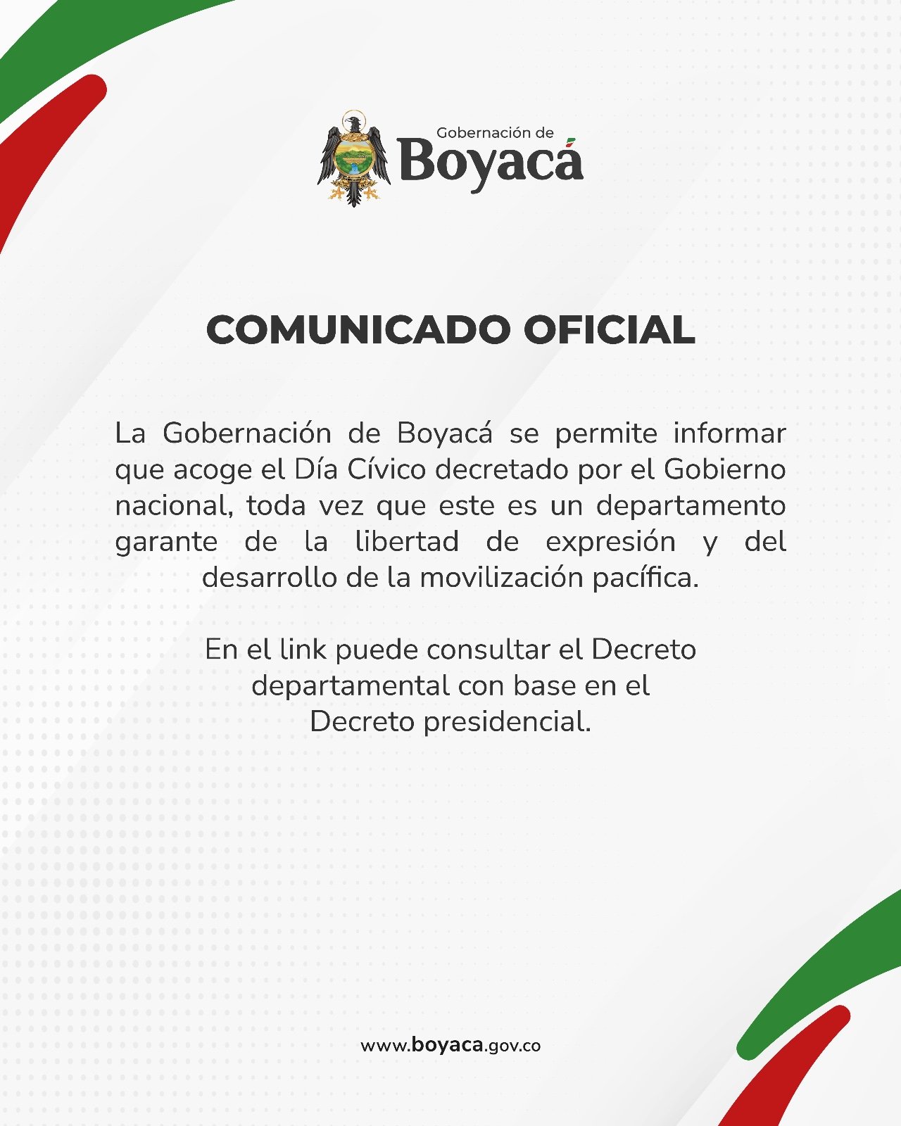 La Gobernación de Boyacá, a través del decreto 0258 del 17 de marzo del 2025, dio a conocer que suspensión de actividades de funcionarios públicos y colegios oficiales, indicando que se acoge al día cívico decretado por el Gobierno Nacional.