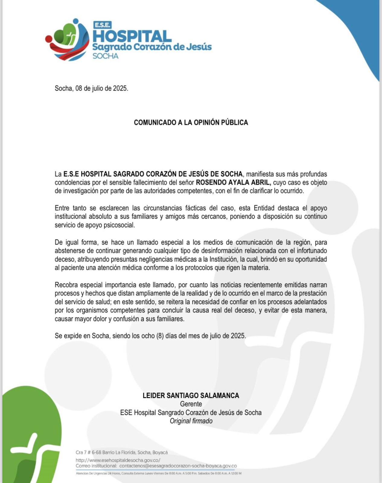 Debido a la situación, el Hospital Sagrado Corazón de Socha emitió un comunicado en el que manifestó sus condolencias por el fallecimiento del señor Rosendo, indicando que el caso es objeto de investigación por parte de las autoridades competentes, esto con el fin de esclarecer lo ocurrido en torno a la muerte del Ayala. Asimismo, en el comunicado se lee que ponen a disposición de la familia del hoy fallecido del servicio de apoyo psicosocial.