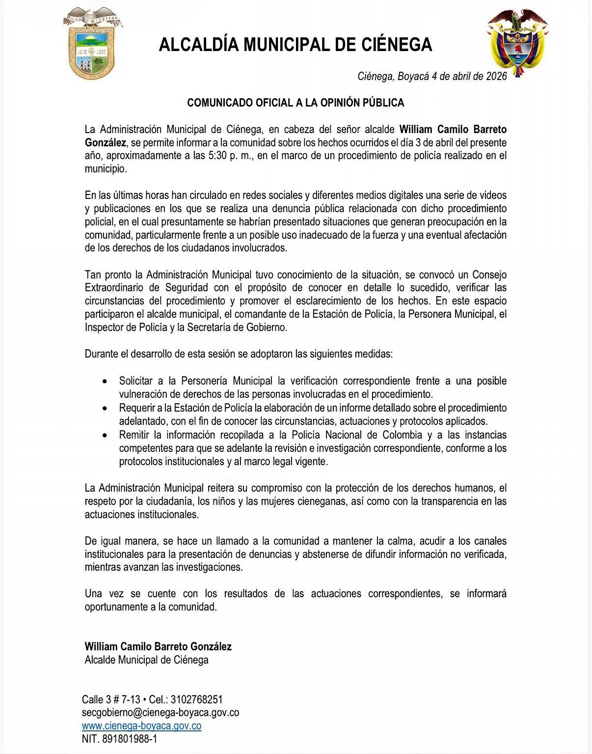 La Alcaldía Municipal de Ciénega, Boyacá, se pronunció frente a un procedimiento policial ocurrido el pasado 3 de abril de 2026 hacia las 5:30 de la tarde, que ha generado controversia en redes sociales por la difusión de videos y denuncias ciudadanas sobre un presunto uso inadecuado de la fuerza y posibles vulneraciones de derechos.