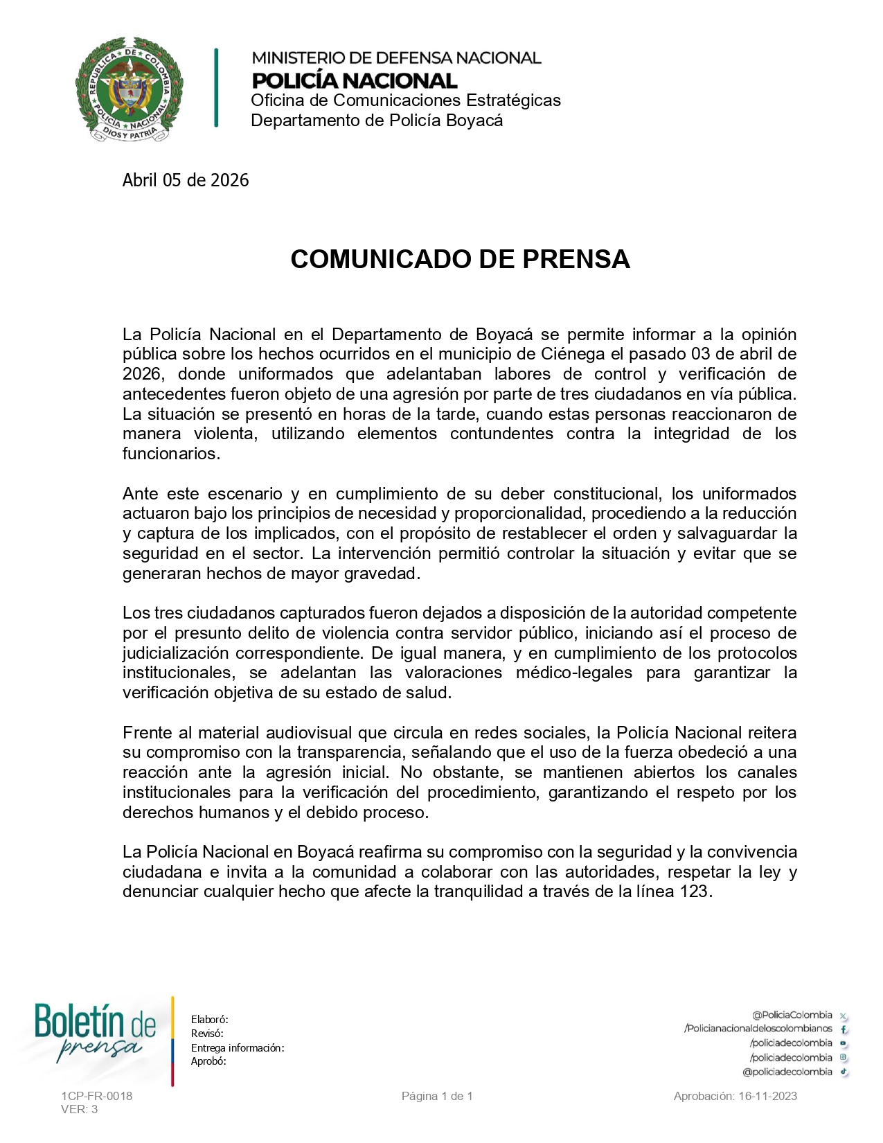 Por su parte, la Policía Nacional en Boyacá entregó su versión de los hechos, señalando que el procedimiento se originó cuando uniformados que realizaban labores de control y verificación de antecedentes fueron presuntamente agredidos por tres ciudadanos en vía pública.